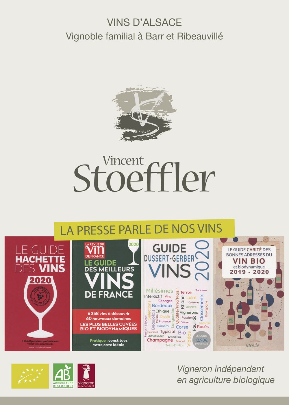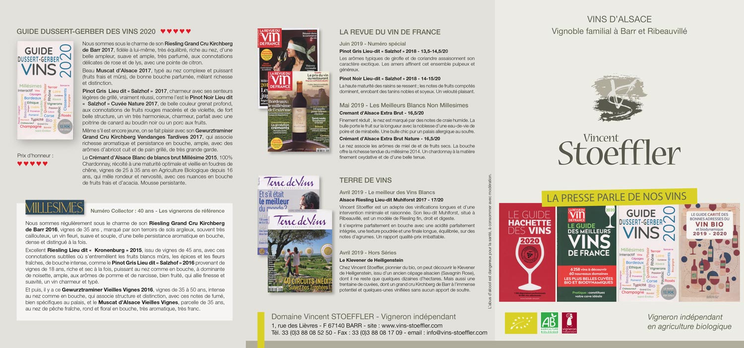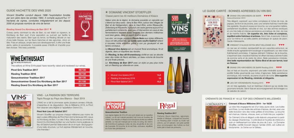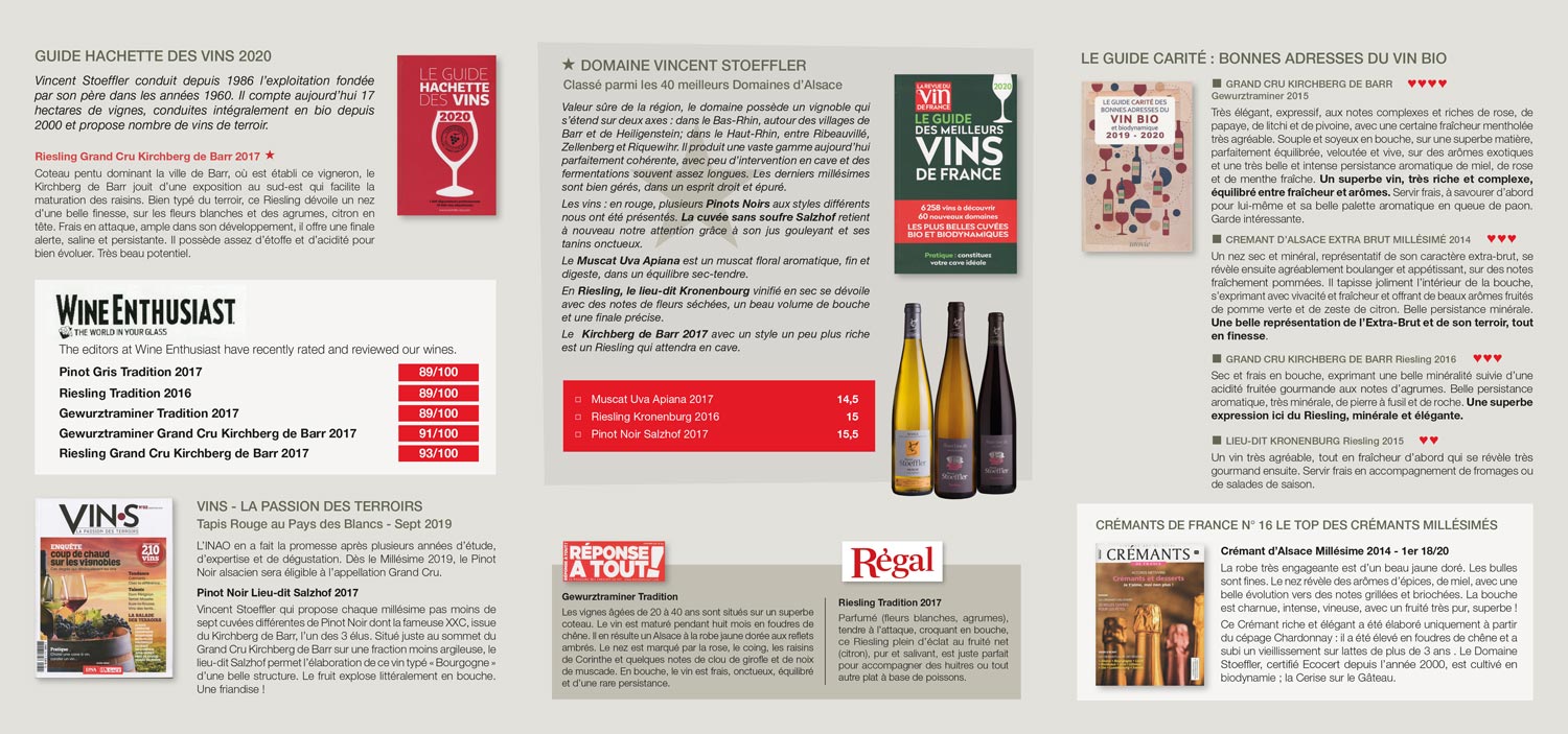 GUIDE HACHETTE DES VINS 1 étoile pour le Riesling Grand Cru Kirchberg de Barr 2017 DUSSERT-GERBER Prix d’honneur pour le Domaine Vincent Stoeffler de Barr GUIDE DES MEILLEURS VINS DE FRANCE, Le Domaine classé parmi les 40 meilleurs domaines d’Alsace GUIDE CARITÉ, 4 cœurs pour le Gewurztraminer Grand Cru Kirchberg de Barr 2015 …