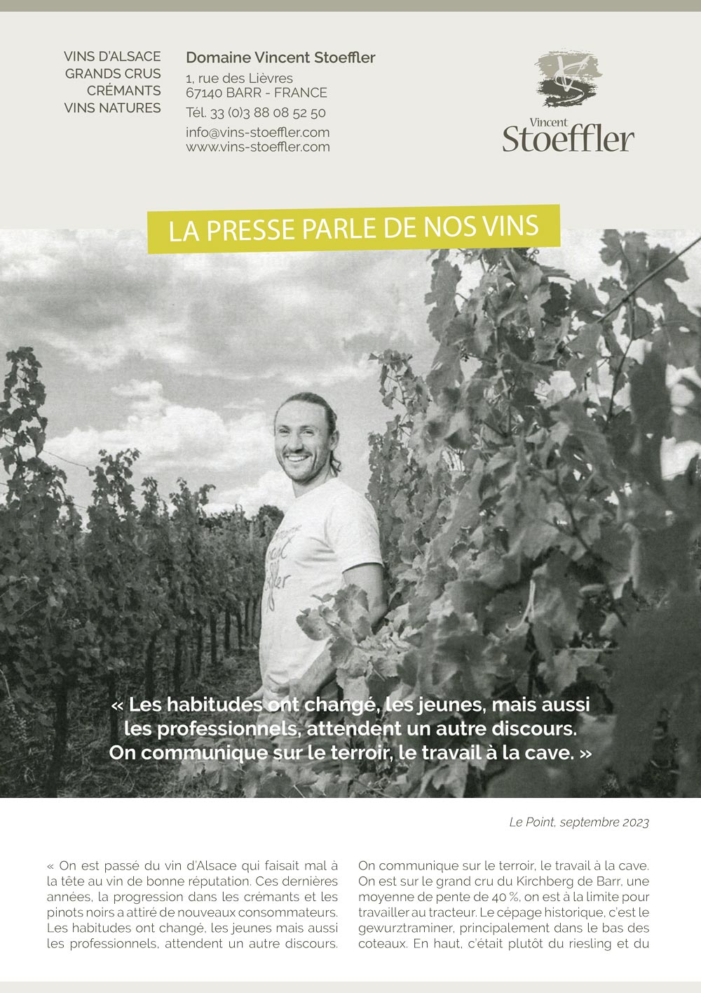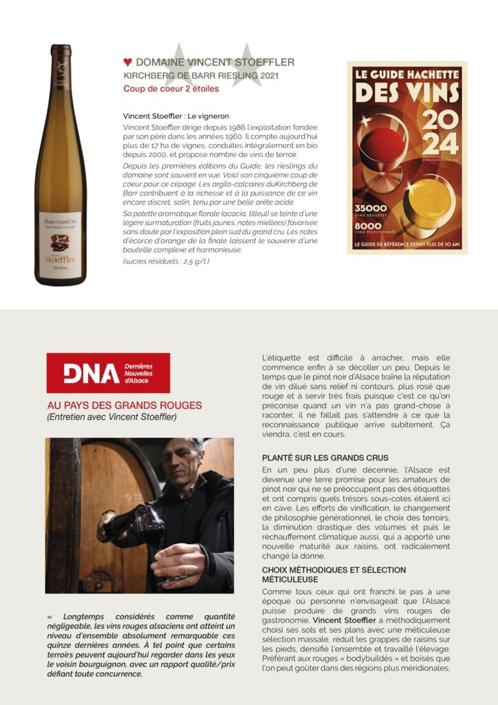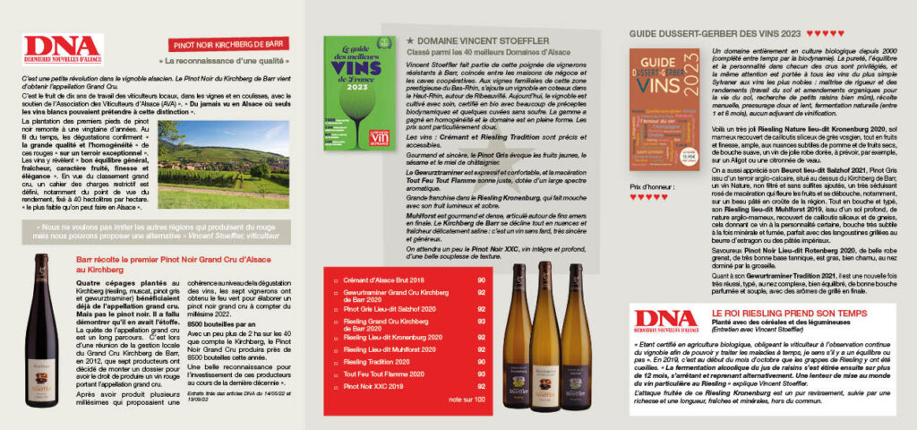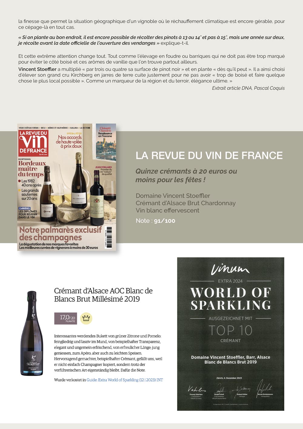 LE POINT SPÉCIAL VINS AOC Alsace Riesling Grand Cru Kirchberg Barr 2021 LA REVUE DU VIN DE FRANCE Quinze crémants à 20 euros ou moins pour les fêtes ! 91/100 pour le Crémant Brut Chardonnay DNA Au pays des rouges (Entretien avec Vincent Stoeffler) GUIDE HACHETTE DES VINS 2024, GUIDE DES MEILLEURS VINS DE FRANCE 2024 …